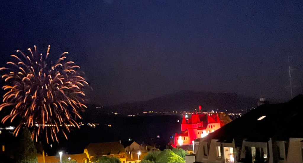 One of the problems of fireworks, besides the danger of starting forest fires, is that they tend to be loud, very loud even and that most animals do not like that noise, as thunders are also scary and I imagine cannons would also be. My two cats are not the exception so when the fireworks started they both took cover under the bed or under a sofa and remained there for the duration. At first I did not recognize the noise of the fireworks as I was sure there would be none, but curiosity, that killed the cat but not me, forced me to go out and find to my great surprise and pleasure that fireworks were on, in the middle of the lake and that they were really great. The Castle of Nyon, which I can see from my balcony, was all lit in the national red with white crosses. The show lasted almost 30 minutes and it was really nice, beautiful and noisy but once a year is not too bad.