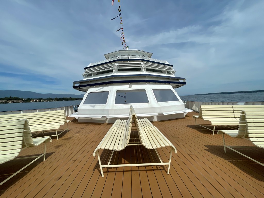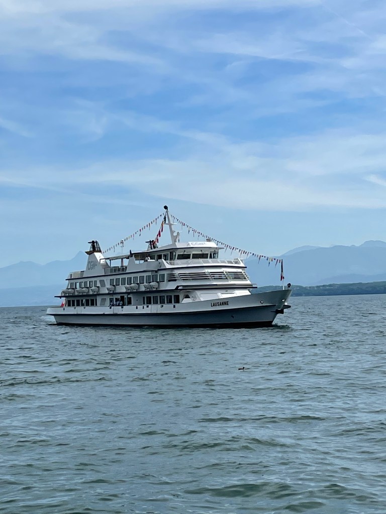 The meeting point was by the pier of my town. I arrived early to make sure I found parking for Choqui and then went to the meeting point. And suddenly lots of people started arriving from all corners of the place, in small or large groups with the common denominator that most had white hair or were bottle blond or bottle redheaded. Very few of us were natural brunettes with few white hair and of course the number of canes and walking sticks and walkers was great. There were few “youngsters” to help in the logistics of embarking all of us on the MS Lausanne, big boat that services the various ports of Lake Geneva and that had been freighted for our outing. The boat holds up to 1,200 persons, but for the occasion it was only for us the oldies, and we were ONLY 500!!!