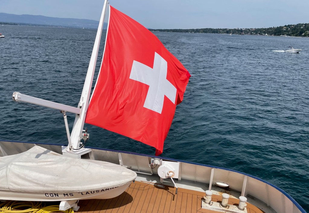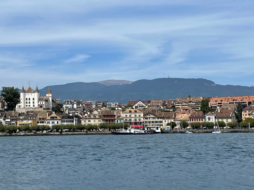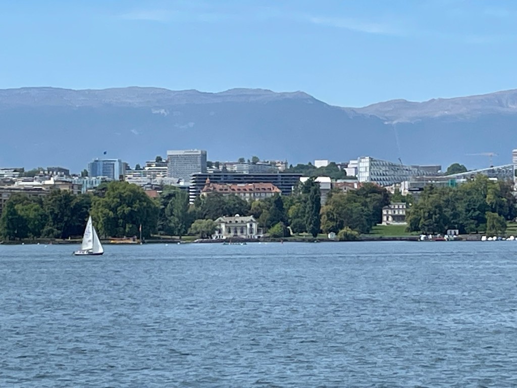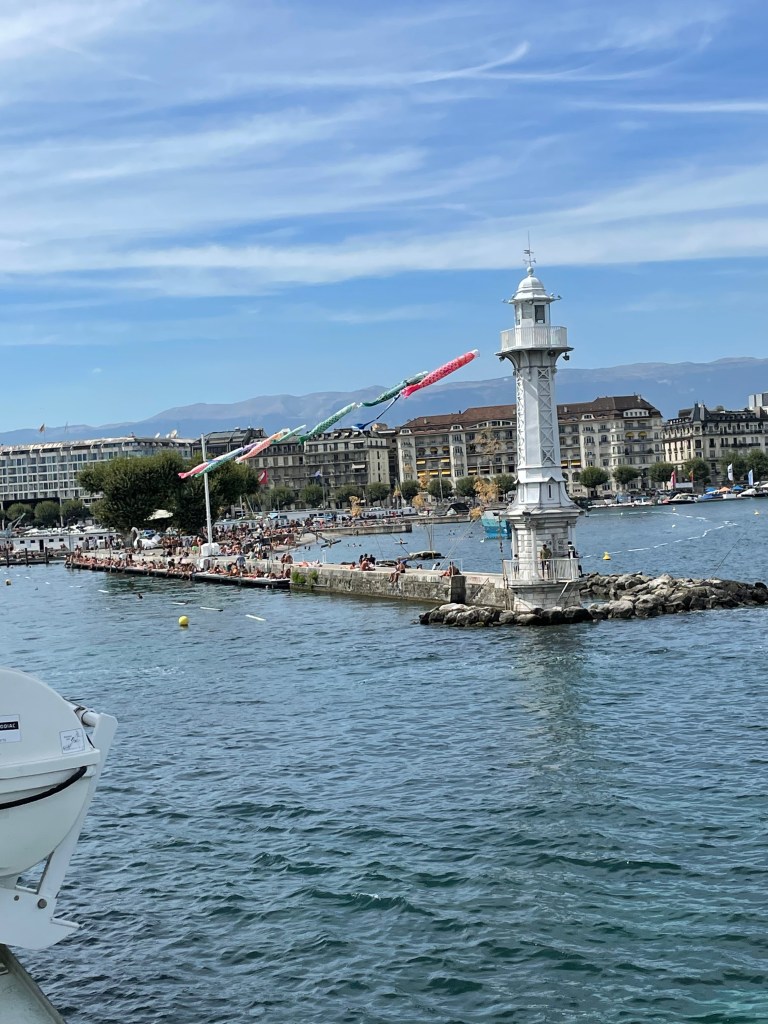 The weather was magnificent and the sun shining in full splendour, all were happy and smiling and looking forward to a nice tour of the lake. Once in the high seas of the lake we started towards Geneva and seen from the water, the coastline looks different, it was fun to identify the various towns by their churches, castles, houses or lack of. In the meantime we also enjoyed the company of others, met some for the first time others were known from before, so the mood was relaxed, the lunch was pleasant, and finally we arrived close to Geneva, with the international world of Geneva with its very distinct buildings, where I had worked so many years, then the Bains de Paquis with the lighthouse and the pier full of people having fun, enjoying the sun and just doing nothing in a good spirit.