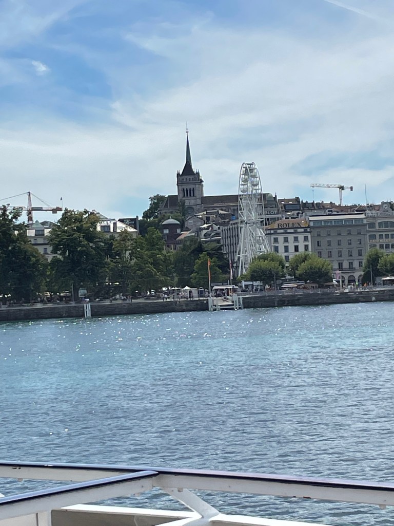 Since the boat cannot go further into the city it turned around and all the while we were enjoying the famous Jet d’eauwhich is a landmark of Geneva and that was in full splendour showing all why the city is beautiful. As background one could see the spires of the Cathedral and also the ferry wheel installed in the English Garden. We started the return to my town always enjoying the tour, with live music in case you wanted to dance, which some oldies did and of course as is normal, the trip back home was faster than the outgoing tour.